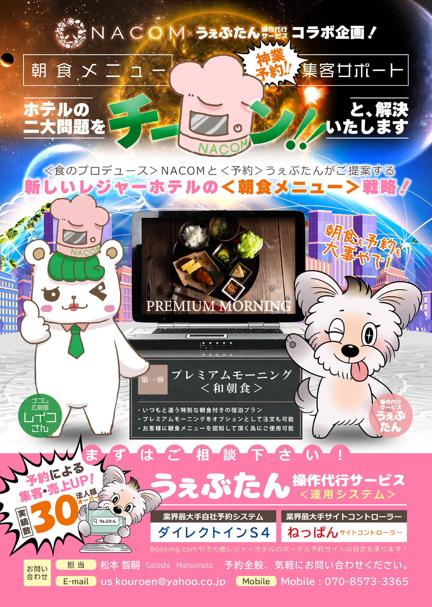 各ホテル関連業者・メーカー様とのコラボレーションで実現できるクライアントホテル様への「予約」システムの独自性のご提案、WEBコンテンツ・インスタ等SNSの活用・プラン画像等の制作などをうぇぶたん独自のネットワークにより実現いたします!