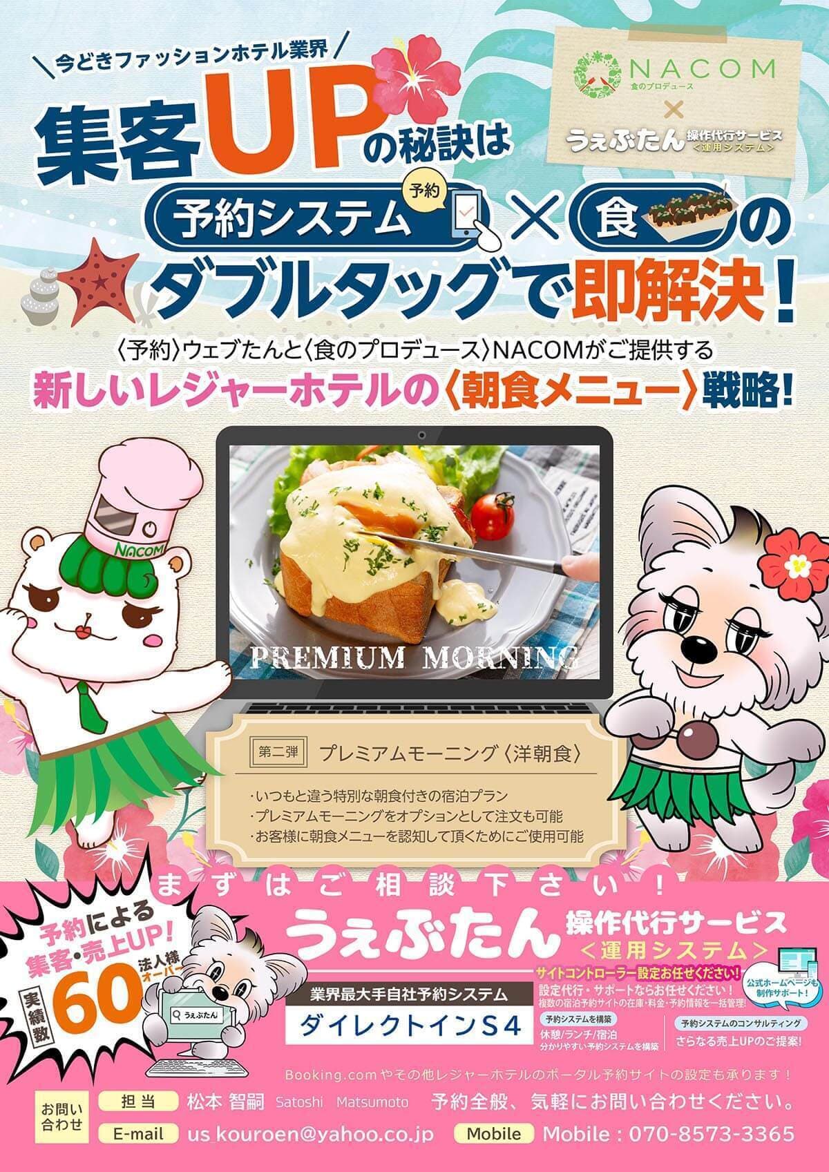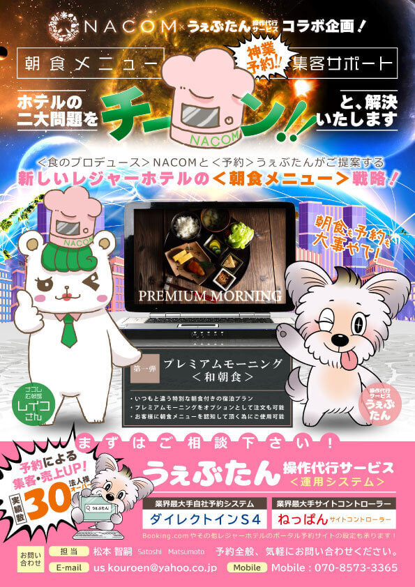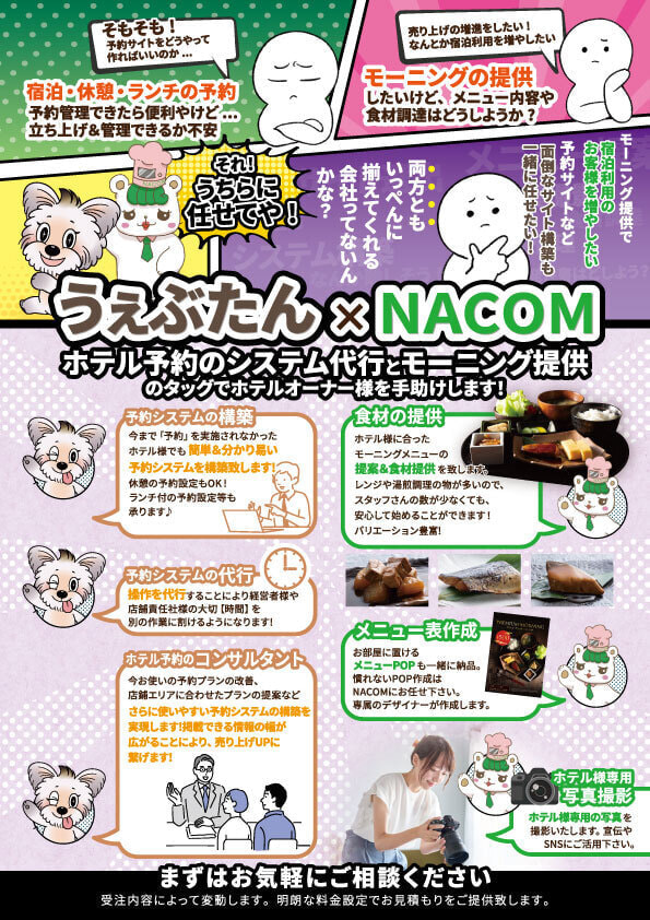 ただ、「メニューの内容はどうしようか?」「食材の選定、調達はどうした良いの?」というお悩みをお持ちのホテルオーナー様も多いと思います。そのようなお悩みを解決できる会社が株式会社NACOMです。